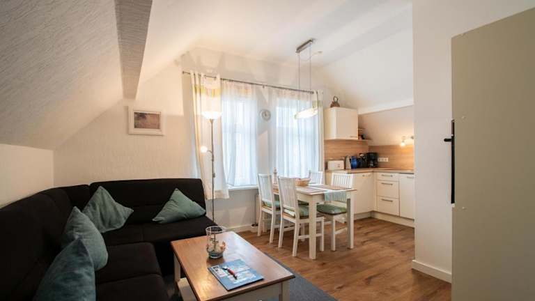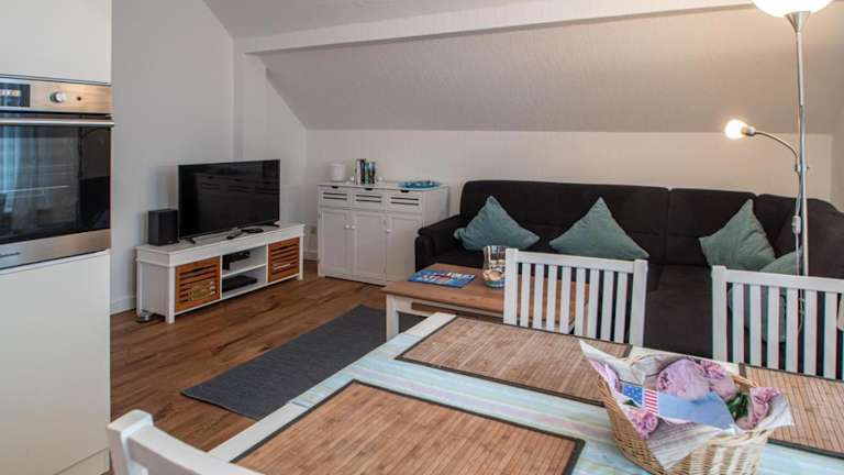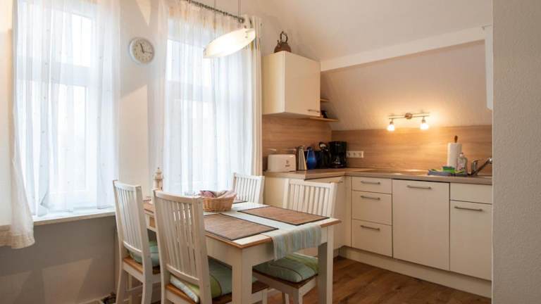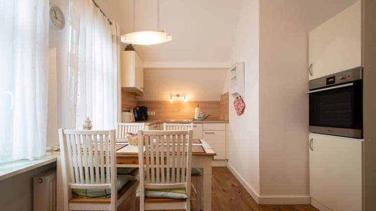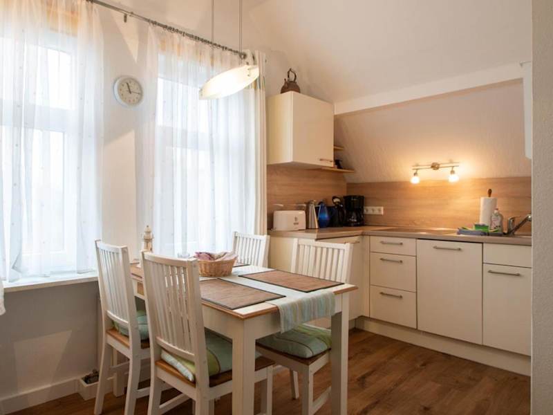 Die Ferienwohnung bietet eine Küchenzeile, die mit einem Kühlschrank, Geschirrspüler, Ofen, Kaffeemaschine und Wasserkocher ausgestattet ist. Informationen zu Verpflegungsmöglichkeiten außerhalb der Küche sind nicht vorhanden.