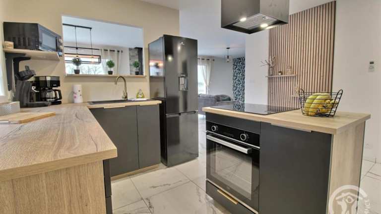 Das Ferienhaus bietet eine voll ausgestattete Küche, die mit einem Kühlschrank, einem Geschirrspüler, einer Waschmaschine, einem Ofen und einer Mikrowelle ausgestattet ist. Für die Selbstversorgung sind alle benötigten Kochutensilien vorhanden.