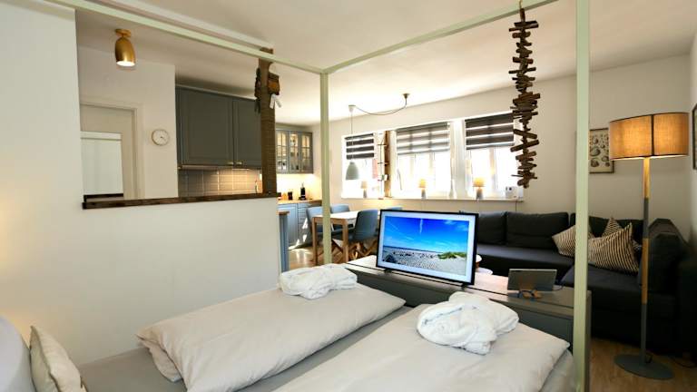 Die Ferienwohnung verfügt über 1 Schlafzimmer und ist ausgestattet mit einem Flachbild-TV mit Satellitenkanälen, einer gut ausgestatteten Küche mit Kühlschrank und Geschirrspüler sowie einem Badezimmer mit Dusche. Handtücher und Bettwäsche werden bereitgestellt.