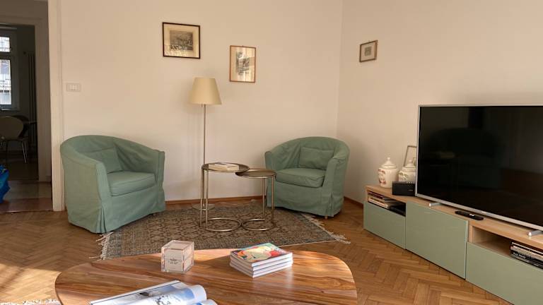 Das Wohnzimmer ist hell und komfortabel und mit einem 55-Zoll-Fernseher mit Zugang zu Satelliten- und Netflix-Kanälen, einem großen Sofa und zwei Sesseln ausgestattet. Die Küche ist brandneu und verfügt über einen Geschirrspüler, eine Waschmaschine mit Trockner, einen normalen und einen Mikrowellenherd, einen neuen 50er Jahre Stand-Alone-Kühlschrank und einen Tisch für 6 Personen. Sie ist für Personen, die gerne kochen bestens ausgestattet. Für Familien mit Kindern sind auf Anfrage ein Kinderbett und ein Stokke-Hochstuhl erhältlich. Der nächste Supermarkt sowie verschiedene Geschäfte und Dienstleistungsbetriebe befinden sich 200 m vom Apartment entfernt.