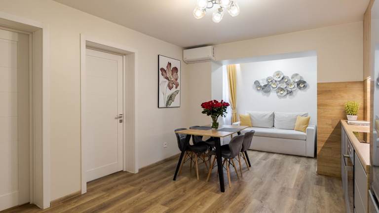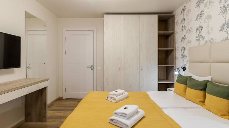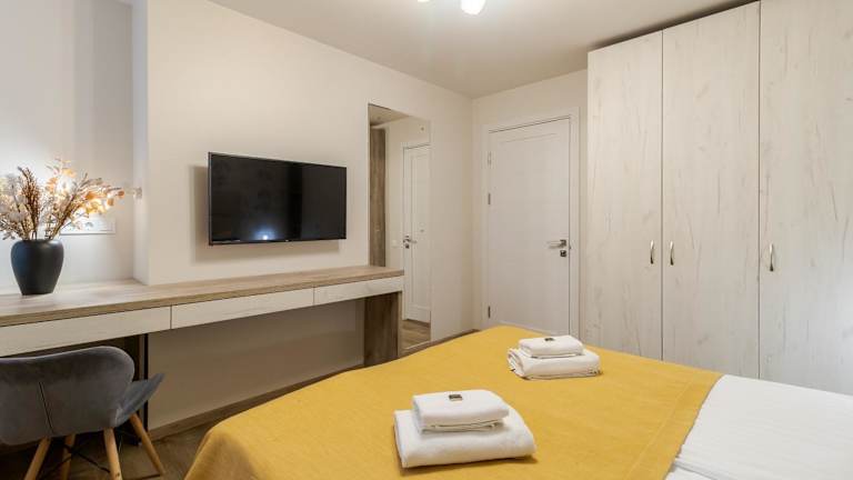 Die Ferienwohnung verfügt über zwei Schlafzimmer, ein Wohnzimmer, ein Badezimmer mit Bidet und Dusche sowie sämtliche notwendige Annehmlichkeiten wie Handtücher und Bettwäsche.
