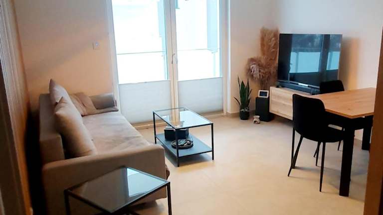 Die Ferienwohnung umfasst ein Schlafzimmer, ein Wohnzimmer und eine gut ausgestattete Küchenzeile, die mit einem Kühlschrank und einem Geschirrspüler ausgestattet ist. Handtücher und Bettwäsche werden bereitgestellt.