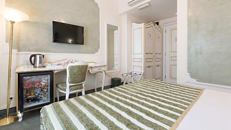 Die 85 Zimmer des Queen's Astoria Design Hotels sind einzigartig gestaltet und mit historischen Möbeln eingerichtet. Die Zimmer sind hell, klimatisiert und verfügen über große Betten, eine Minibar und einen LCD-TV mit Sat- und Kabelkanälen. Das eigene Bad ist mit einer Dusche, einem Haartrockner und kostenfreien Pflegeprodukten ausgestattet.