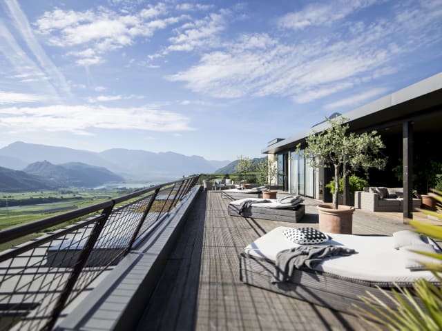 Einzigartig ist die Panorama-Lage nahe dem historischen Zentrum des Weindorfes Kaltern. Beeindruckend der Ausblick von der Dachterrasse "VISTA" auf die umliegenden Weinberge, die mediterrane Landschaft mit Palmen und Olivenbäumen, der Blick auf Südtirols Bergkulisse und vorne glitzert der Kalterer See.