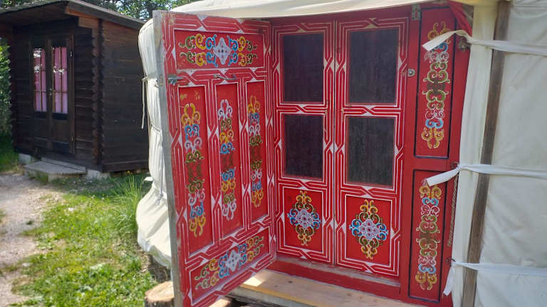 Die Jurte im Destination Ailleurs bietet einen komfortablen Aufenthalt mit einem Esstisch und einem eigenen Badezimmer mit Dusche. Genießen Sie den Bergblick und nutzen Sie den Sitzbereich im Freien für zusätzlichen Komfort.