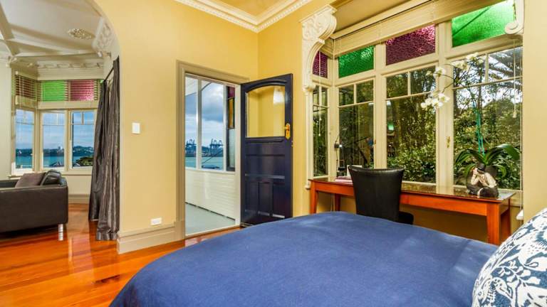 Geschmackvoll eingerichtetes Zimmer mit Balkon und wunderschönem Blick auf die Bucht von Auckland. Wenige Gehminuten vom Fähranleger der Fähren u.a. nach Waiheke Island und Auckland.