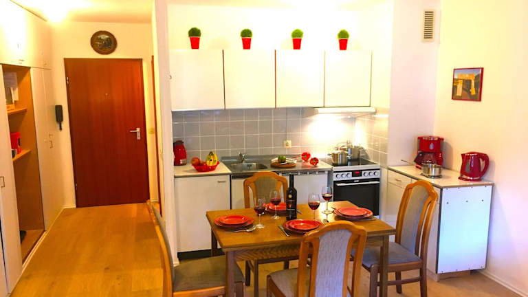 Die Ferienwohnung verfügt über ein Schlafzimmer, ein Flachbild-TV mit Satellitenkanälen, eine gut ausgestattete Küche mit Kühlschrank und Ofen sowie ein Badezimmer mit Dusche. Handtücher und Bettwäsche werden bereitgestellt.