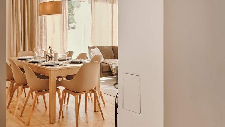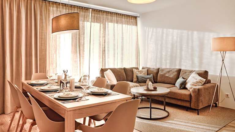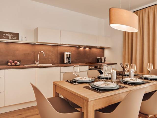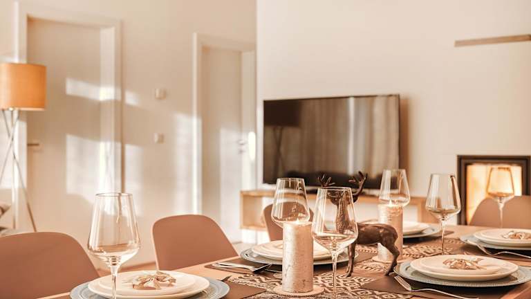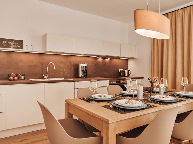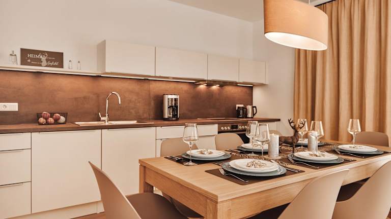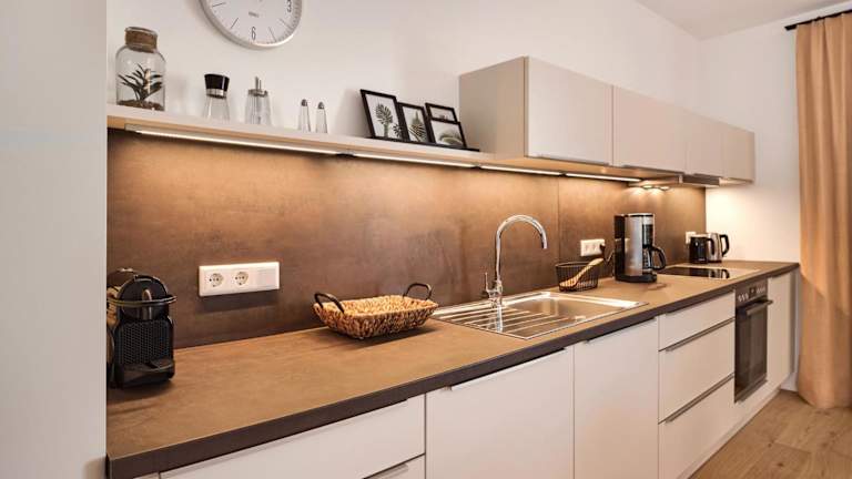 Die Ferienwohnung umfasst zwei Schlafzimmer, ein Wohnzimmer mit TV, eine gut ausgestattete Küche mit Kühlschrank und Geschirrspüler sowie ein Badezimmer mit Dusche.
