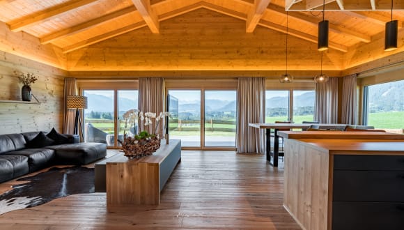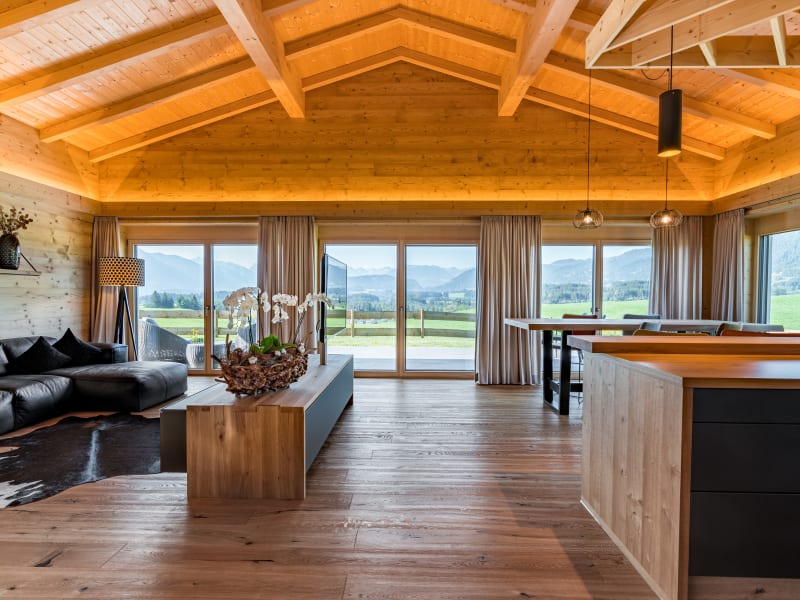 Zwischen modern, gemütlich und exklusiv: Auf 840 Höhenmetern erwarten Sie zwei 140 m² große Ferienwohnungen im Chaletstil mit offenem Wohnbereich und traumhafter Aussicht auf die Allgäuer Berge. Beide Einheiten sind ausgestattet mit 2 Schlafzimmern, 2 Badezimmern en Suite und einer privaten Sauna mit Aussicht. Die Sonnenterrasse mit angrenzendem Garten und herrlich freiem Blick auf das Allgäuer Bergpanorama ist das Highlight der Chalets.