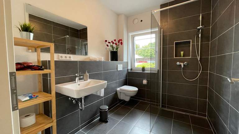 Die Ferienwohnung verfügt über drei Schlafzimmer, ein Wohnzimmer, einen Flachbild-TV sowie eine gut ausgestattete Küche mit Kühlschrank und Geschirrspüler. Es gibt zwei Badezimmer mit Dusche. Handtücher und Bettwäsche werden zur Verfügung gestellt.