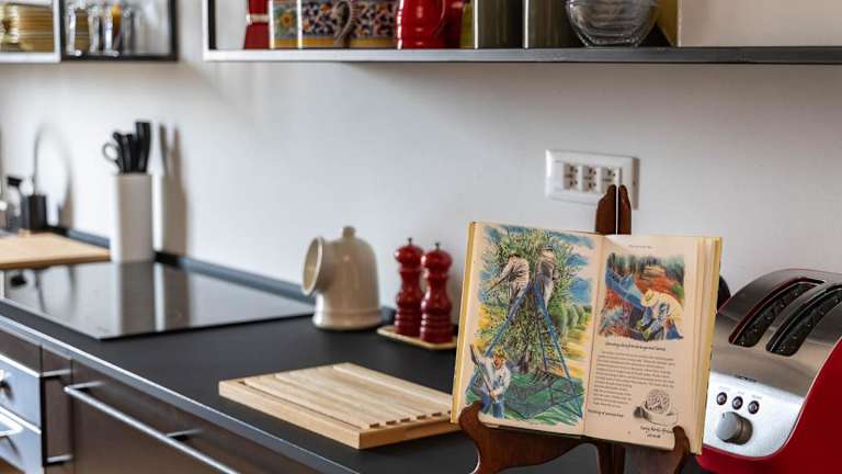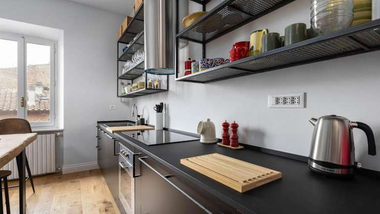Die Unterbringung umfasst eine Küche, die mit einem Kühlschrank, einem Ofen und einer Mikrowelle ausgestattet ist, um Selbstversorgerfreundlichkeit zu gewährleisten.