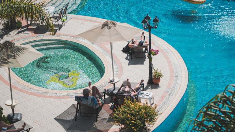 Die Snackbar im Dionysos Village befindet sich günstig am Pool und bietet leichte Mahlzeiten und erfrischende Getränke. Im Poolbereich können Sie auch ein Frühstücksbuffet genießen.