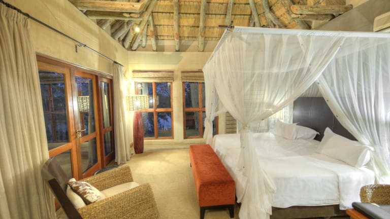 Die Chalets bieten eine einmalige Flusslage mit Blick auf den Okavango Fluss und sind ausgestattet mit einem kombinieren Wohn-/Schlafbereich, Klimaanlage, Moskitonetz, Sitzecke und einem Balkon oder einer Terrasse. Die Badezimmer sind geräumig und verfügen über eine freistehende Badewanne, Außendusche und separate Dusche.