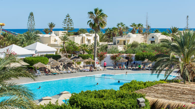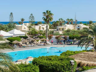 Das Djerba Aqua Resort mit traditioneller Architektur im Außenbereich und modernen Einrichtungen im Innenbereich verbindet das Erbe der Region mit Komfort und Stil. Durch die Lage in der Nähe eines Sandstrandes sind Familienausflüge in den Sand und ans Meer nur einen kurzen Spaziergang entfernt. Eines der größten Merkmale des Hotels bedeutet, dass Sie nicht weit laufen müssen, um für Furore zu sorgen. Der hoteleigene Wasserpark bietet viele Möglichkeiten, um Wasserliebhaber jeden Alters glücklich zu machen. Sie finden ein Wellenbad, einen Lazy River, Ausritte und 13 Rutschen zur Auswahl sowie ein Piratenschiff für die Kinder. Wenn Sie in Ihrem Urlaub aktiv bleiben möchten, stehen Ihnen vier Tennisplätze zur Verfügung, auf denen Sie Ihr Können unter Beweis stellen können, sowie Fußball-, Basketball- und Volleyballanlagen. Das Hotel organisiert auch eine Reihe von Fitnesskursen. Wenn Sie sich lieber entspannen und verwöhnen lassen möchten, bietet das hoteleigene Spa eine Reihe von Behandlungen für einige Zeit für sich. Abends werden Sie in den beiden Buffetrestaurants nie hungrig, während die vier À-la-carte-Gerichte jeweils ihre eigene Küche bieten und Ihnen jede Nacht eine große Auswahl bieten. Dank der sechs Bars des Hotels haben Sie immer einen Drink in der Hand.
