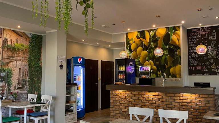 Im Hotelrestaurant können die Gäste speisen, zusätzlich steht eine Bar zur Verfügung, an der Getränke serviert werden.