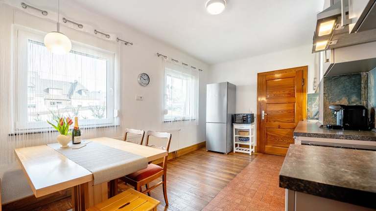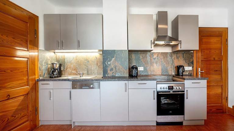 Die Unterkunft verfügt über ein voll ausgestattetes Küche und eine Terrasse mit Gartenblick.