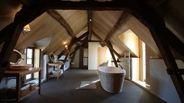 Die Zimmer im Domaine de la Fouardière sind geräumig und individuell eingerichtet, mit freiliegenden Holzbalken und Parkettböden. Jedes Zimmer verfügt über ein eigenes Bad mit Badewanne oder Dusche. Die Einrichtung schafft eine gemütliche und einladende Atmosphäre, in der Sie sich wie zu Hause fühlen können.