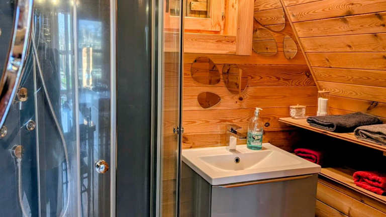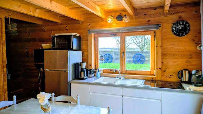 Das Chalet ist mit einer voll ausgestatteten Küche ausgestattet. Diese beinhaltet einen Kühlschrank, einen Ofen, eine Mikrowelle, eine Kaffeemaschine sowie einen Wasserkocher. Vor Ort steht eine Terrasse zur Verfügung, die zum Verweilen einlädt.
