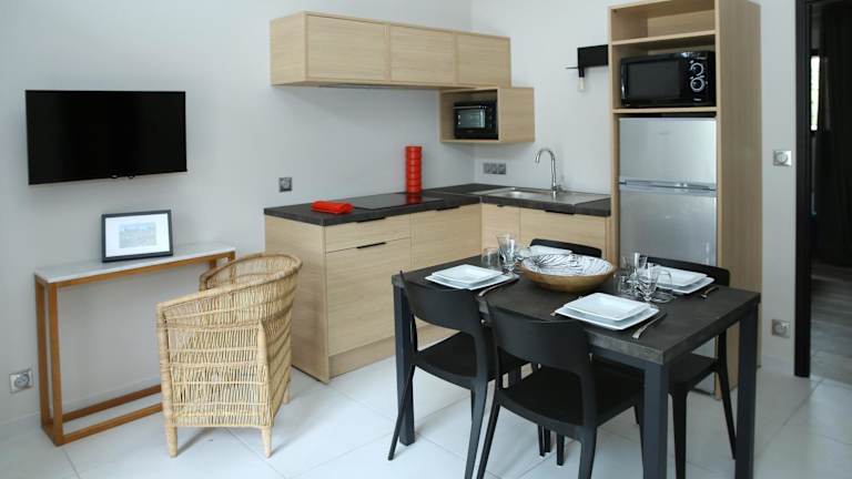 Die Zimmer sind mit Klimaanlage, einem Flachbild-TV und einer voll ausgestatteten Küche inklusive Kühlschrank, Geschirrspüler und Ofen ausgestattet. Ein eigenes Badezimmer umfasst eine Dusche sowie kostenlose Pflegeprodukte. Zu den weiteren Annehmlichkeiten gehören ein Essbereich, eine Kaffeemaschine und ein Wasserkocher.