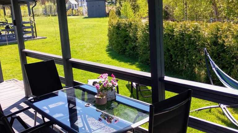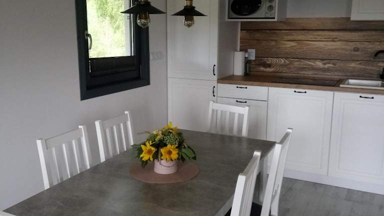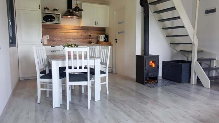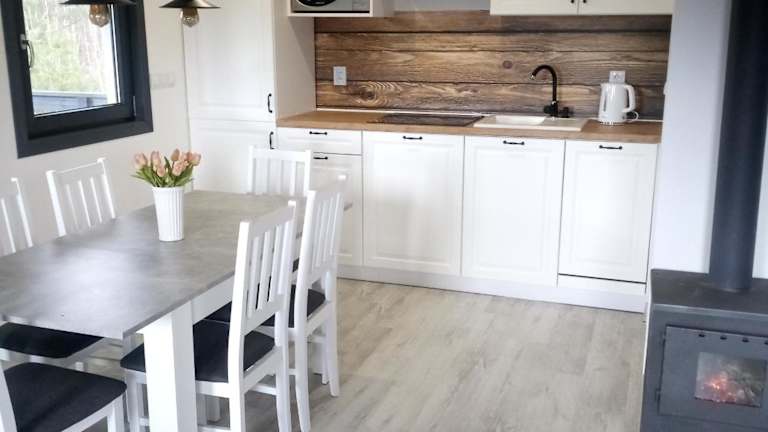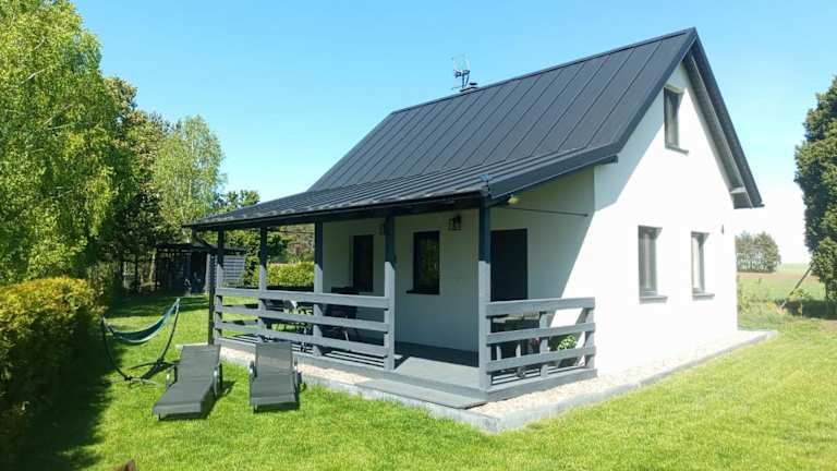 Domek na Kaszubach bietet eine Terrasse mit Gartenblick und liegt in ruhiger Umgebung. Das Ferienhaus umfasst zwei Schlafzimmer, ein Wohnzimmer sowie eine voll ausgestattete Küche. Es handelt sich um eine privat geführte Unterkunft, in der keine Junggesellenabschiede oder ähnliche Feiern gestattet sind.