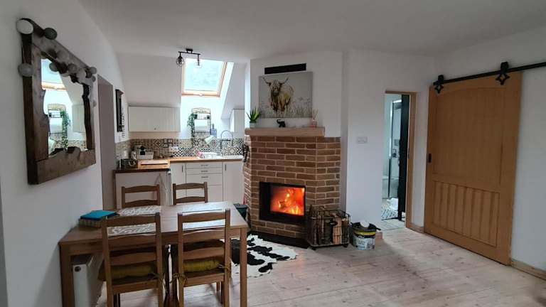 Das Ferienhaus umfasst zwei Schlafzimmer sowie ein Wohnzimmer und einen Essbereich. Es ist ausgestattet mit einem Flachbild-TV, einer Küche mit Kühlschrank, Handtüchern und Bettwäsche.