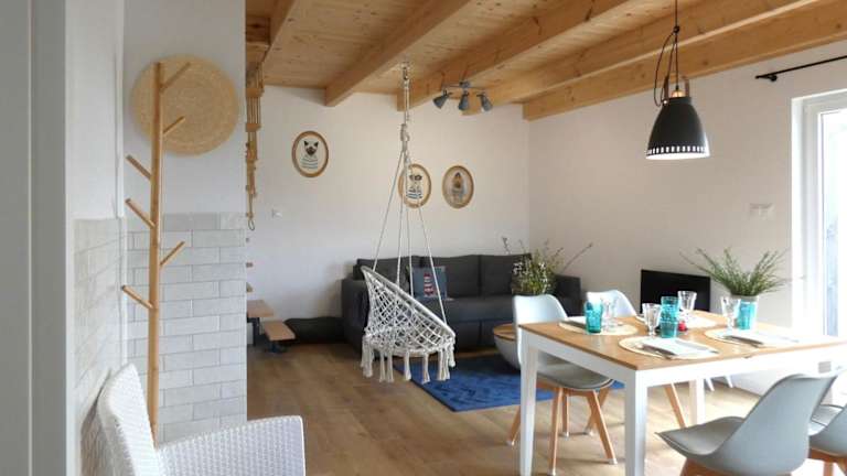 Das Ferienhaus Domki Trzy - 3 verfügt über 3 Schlafzimmer, ein gemütliches Wohnzimmer und eine voll ausgestattete Küchenzeile. Die Küchenzeile ist mit einem Kühlschrank und einer Kaffeemaschine ausgestattet, so dass Sie Ihre eigenen Mahlzeiten zubereiten können. Es gibt auch 2 Badezimmer mit einer Dusche und einem Haartrockner. Handtücher und Bettwäsche werden im Ferienhaus gestellt, so dass Sie sich um nichts kümmern müssen.