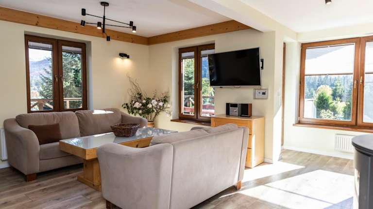 Domy Sywarne z Sauną i widokiem na góry bietet kostenloses WLAN, einen Kinderspielplatz, einen Garten sowie einen kostenlosen Privatparkplatz. Die Unterkunft verfügt über eine Terrasse mit Bergblick.