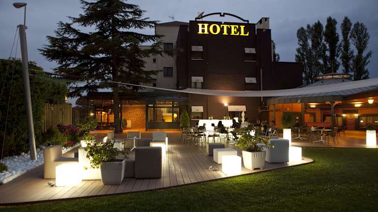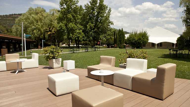 Auf der Terrasse des Hotels können die Gäste das schöne Wetter genießen und sich entspannen. Der weitläufige Park bietet außerdem die Möglichkeit, sich im Freien aufzuhalten und die Natur zu genießen.