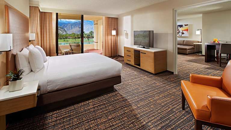 Die Zimmer im DoubleTree by Hilton Golf Resort Palm Springs sind schallisoliert und bieten kostenloses WLAN. Zur Ausstattung gehören auch Kabel-TV, kostenfreie Pflegeprodukte, eine Kaffeemaschine und ein kleiner Kühlschrank. Jedes Zimmer verfügt über eine Terrasse oder einen Balkon mit Blick auf den See, die Golfplätze und das Gebirge San Jacinto.