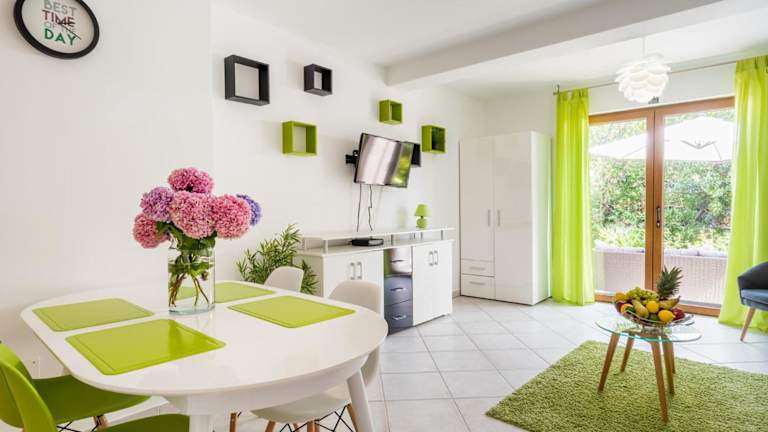 Die Apartments im Downtown Apartments Dorian and Nadia sind mit allem ausgestattet, was Sie für einen komfortablen Aufenthalt benötigen. Jede Wohneinheit verfügt über eine voll ausgestattete Küche mit einem Esstisch, so dass Sie Ihre Mahlzeiten bequem zubereiten können. Ein Flachbild-Sat-TV sorgt für Unterhaltung und das private Badezimmer ist mit einem Bidet, kostenfreien Pflegeprodukten und einem Haartrockner ausgestattet. Einige Apartments bieten zudem einen Balkon oder eine Terrasse, von der aus Sie den Blick auf das Meer oder den Garten genießen können.