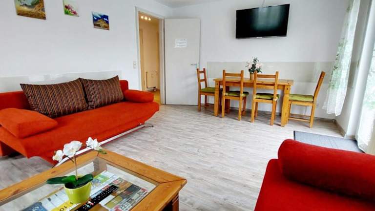 Die Ferienwohnung beinhaltet ein Schlafzimmer, ein Wohnzimmer, einen Flachbild-TV sowie eine gut ausgestattete Küche mit Kühlschrank und Geschirrspüler. Außerdem stehen ein Badezimmer mit Dusche, Handtücher und Bettwäsche zur Verfügung.