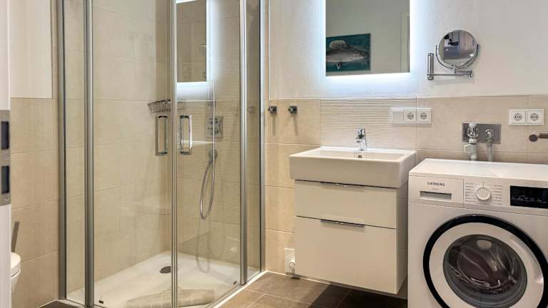 Die Ferienwohnung verfügt über 2 Schlafzimmer, eine Küchenzeile mit Kühlschrank und Geschirrspüler sowie ein Badezimmer mit Dusche, Haartrockner und Waschmaschine. Handtücher und Bettwäsche können gegen Aufpreis zur Verfügung gestellt werden.