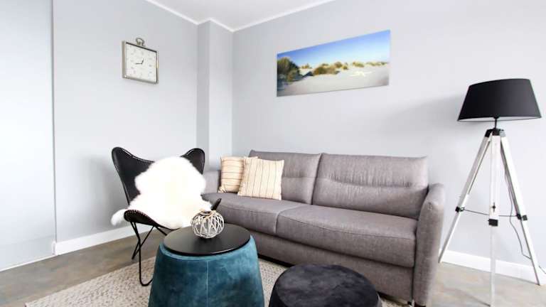 Die Ferienwohnung verfügt über ein Schlafzimmer sowie ein Wohnzimmer mit Fernseher. Die voll ausgestattete Küchenzeile bietet einen Kühlschrank und Geschirrspüler. Außerdem gibt es ein Badezimmer mit Dusche. Handtücher und Bettwäsche werden zur Verfügung gestellt. Es gibt Gartenmöbel, die zur Nutzung im Freien einladen.