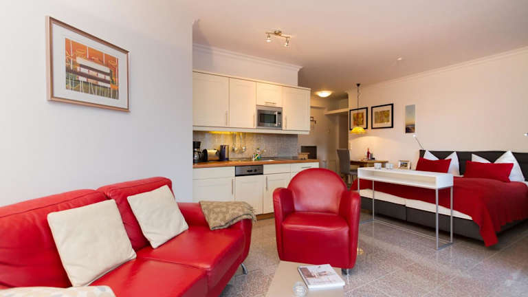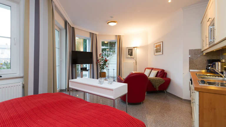 Die Ferienwohnung umfasst ein Schlafzimmer, einen Flachbild-TV und eine voll ausgestattete Küchenzeile mit Kühlschrank und Geschirrspüler. Handtücher und Bettwäsche werden bereitgestellt.