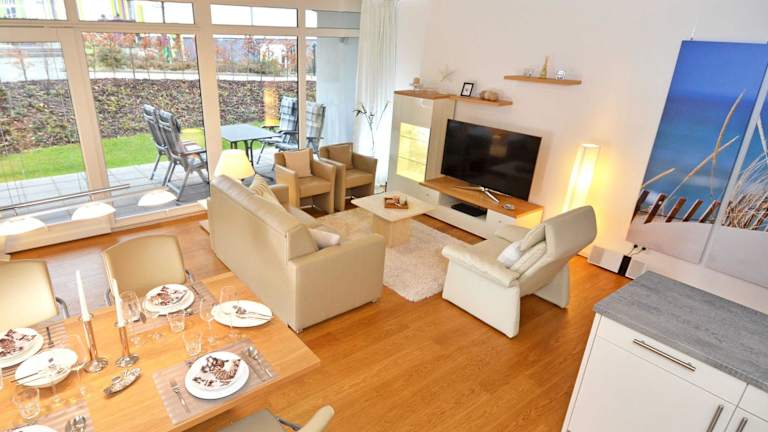 DünenResort Binz - Fewo 04 "Strandperle" bietet eine Terrasse und einen Garten sowie kostenloses WLAN für die Gäste.