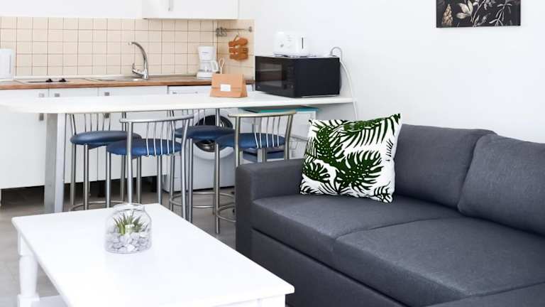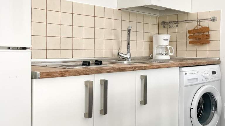 Die Ferienwohnung besteht aus einem Schlafzimmer und einem Wohnzimmer, das mit einer voll ausgestatteten Küche inklusive Kühlschrank und Kaffeemaschine sowie einem Badezimmer mit Dusche und Haartrockner ausgestattet ist. Handtücher und Bettwäsche werden bereitgestellt.