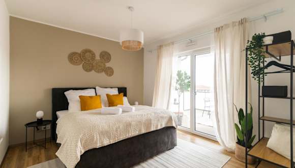 Das Apartment im DWELLSTAY - Modernes Apartment ist geräumig und modern eingerichtet. Mit 55 qm bietet es viel Platz für bis zu zwei Personen. Es verfügt über ein Schlafzimmer, ein Wohnzimmer, eine voll ausgestattete Küche mit Kühlschrank und Geschirrspüler sowie ein Badezimmer mit Dusche. Für Ihren Komfort sind Handtücher und Bettwäsche im Apartment vorhanden. Genießen Sie den Balkon mit Blick auf die Stadt und entspannen Sie sich nach einem ereignisreichen Tag.