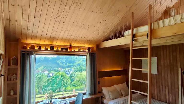 Das Chalet bietet ein Schlafzimmer und ein Badezimmer. Zur Ausstattung zählen Bettwäsche, Handtücher, ein Flachbild-TV, ein Essbereich sowie eine voll ausgestattete Küche. Eine Terrasse mit Blick auf die Berge ist ebenfalls vorhanden.