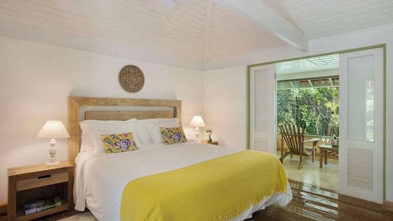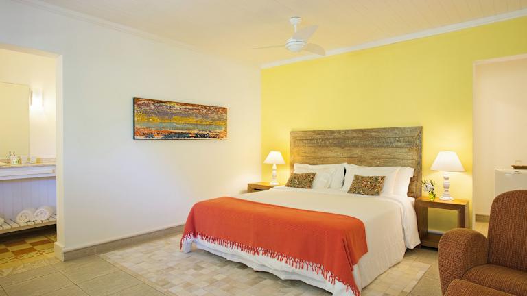 Die Chalets sind in warmen Farbtönen gestaltet und bieten eine eigene Terrasse mit Hängematte und Blick auf den Garten. Zu den Annehmlichkeiten zählen ein TV, eine Minibar, ein DVD-Player, Klimaanlage und Heizung.