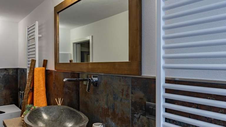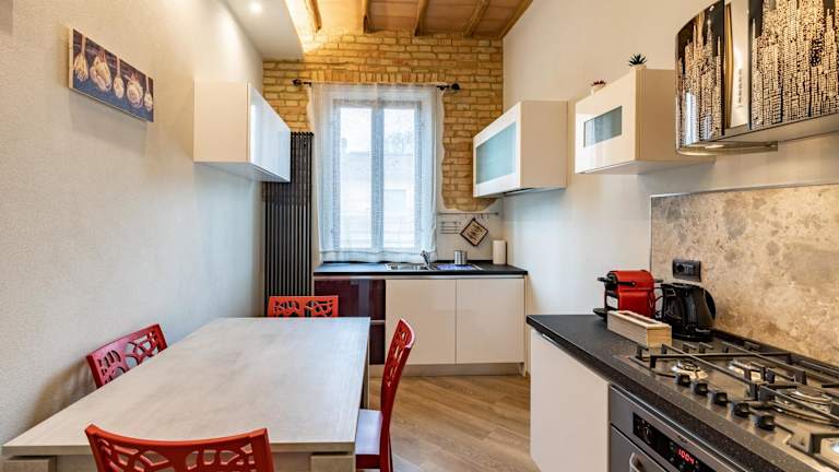 Die Ferienwohnung ist mit einer Küche ausgestattet, die über einen Kühlschrank, Geschirrspüler, Ofen, Kaffeemaschine und Wasserkocher verfügt.