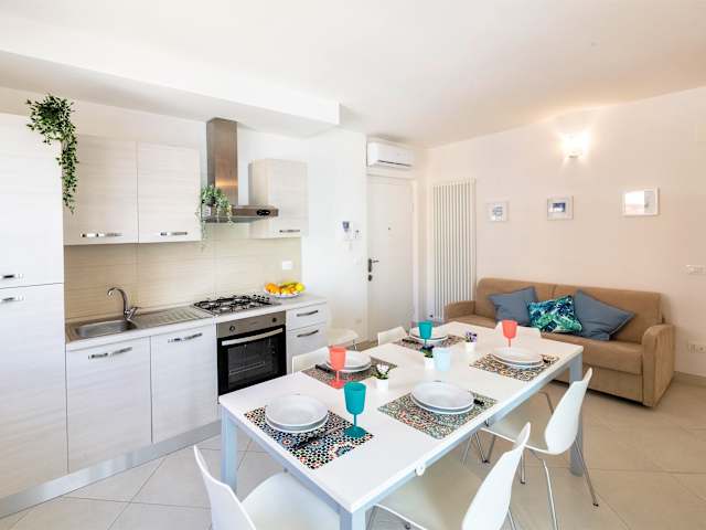 Die Ferienwohnung umfasst zwei Schlafzimmer, ein Wohnzimmer sowie eine voll ausgestattete Küche mit Kühlschrank und Wasserkocher. Ein Badezimmer mit Bidet und Dusche ist ebenfalls vorhanden. Klimaanlage sorgt für zusätzlichen Komfort. Handtücher und Bettwäsche können gegen Aufpreis bereitgestellt werden.