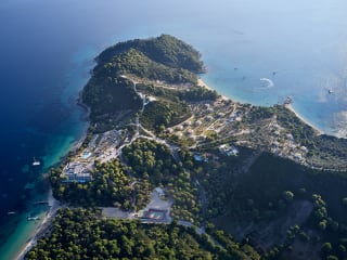 Das Hotel Elivi Skiathos befindet sich in der Umgebung von Koukounaries und ist direkt am beliebten Koukounaries Beach gelegen. Die Umgebung ist geprägt von einem Pinienwald und bietet mit dem klaren türkisfarbenen Wasser und dem feinen Sandstrand ideale Bedingungen für entspannte Urlaubstage. In der Nähe befinden sich zudem weitere Strände wie Big Banana Beach und Little Banana Beach. Die Entfernung zum Flughafen Skiathos beträgt ca. 14 km, während das Stadtzentrum von Skiathos 12 km entfernt ist.