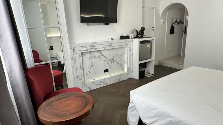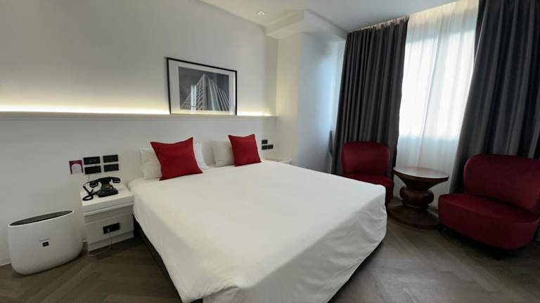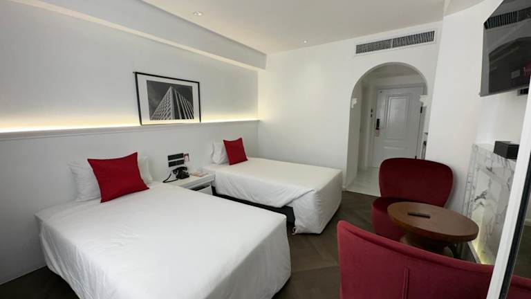 Die Zimmer sind klimatisiert und bieten einen Balkon sowie eine umfangreiche Ausstattung, darunter ein Doppelbett oder Kingsize-Bett, eine Minibar, ein Safe und eine Tee-/Kaffeemaschine. Zusätzlich sind ein Kühlschrank, ein TV mit Satellitenempfang, WLAN und ein Marmorbad mit Badewanne vorhanden. Es stehen auch Familien- und Nichtraucherzimmer zur Verfügung.