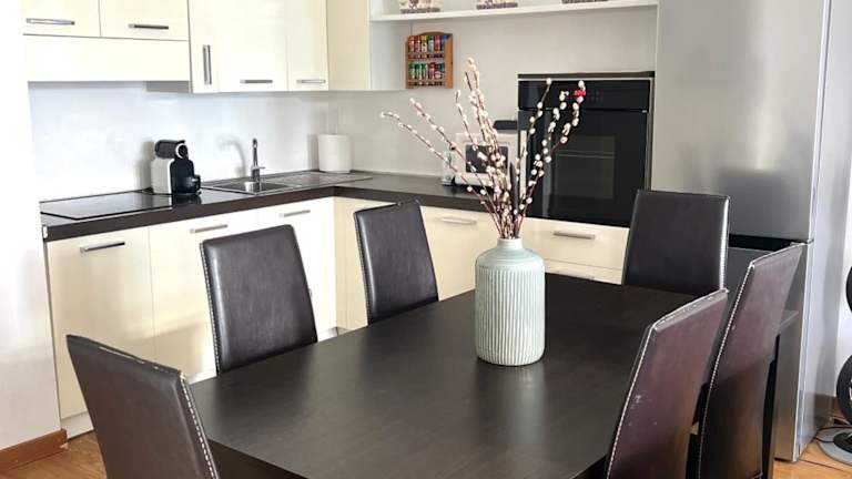 Die Unterkunft bietet ein klimatisiertes Wohngefühl mit 2 Schlafzimmern, einem Wohnzimmer und einer voll ausgestatteten Küche, die einen Kühlschrank und eine Kaffeemaschine beinhaltet. Weiterhin stehen den Gästen ein Badezimmer mit Bidet und Dusche zur Verfügung. Auf Wunsch können Handtücher und Bettwäsche gegen Aufpreis bereitgestellt werden.