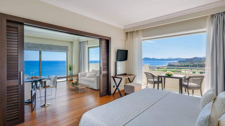 Deluxe-Zimmer (Meerblick / ca.: 30 qm*. Max. Belegung: 3 Erwachsene oder 2 Erwachsene und 1 Kind): Zimmer mit gehobener Ästhetik und modernem Design, ausgestattet mit Wenge- und Zebrano-Möbeln. Das Deluxe-Zimmer ist mit zwei Einzelbetten oder einem Queen-Size-Bett, Fliesen- oder Teppichboden, Wohnbereich sowie mit einem 8 qm großen, vollmöblierten Balkon ausgestattet. Das Badezimmer ist mit schokoladefarbenen Gestaltungselementen veredelt und mit Badewanne, Haartrockner, Vergrößerungsspiegel, Telefon sowie zahlreichen Luxus-Pflegeprodukten ausgestattet. Premium Gästezimmer (Meerblick / ca.: 30 qm*. Max. Belegung: 2 Erwachsene und 1 Kind): Neu gestaltet, mit einem geräumigen und modernen Design, akzentuiert durch eine beruhigende Farbpalette, erstreckt sich das Premium Deluxe Gästezimmer über 30 Quadratmeter. Es verbindet gekonnt Eleganz mit Komfort und ist entweder mit einem Queensize-Doppelbett oder zwei Einzelbetten verfügbar. Dieses stilvolle Gästezimmer befindet sich in den Gebäuden Eos und Helios, ist mit exquisiten Möbeln ausgestattet und verfügt über eine Sitzecke mit Sofa und Schreibtisch. Das geräumige Badezimmer verfügt über eine begehbare Regendusche und luxuriöse Pflegeprodukte sowie eine großzügige Auswahl an erstklassigen Annehmlichkeiten. Abgerundet wird das Gesamterlebnis durch den zusätzlichen 8 Quadratmeter großen möblierten Balkon, der einen unvergleichlichen Panoramablick auf die Ägäis und atemberaubende Sonnenaufgangserlebnisse bietet. Superior Deluxe-Zimmer (Meerblick / ca.: 30 qm*. Max. Belegung: 2 Erwachsene): Zimmer mit gehobener Ästhetik und modernem Design, ausgestattet mit Wenge-Möbeln. Das Superior Deluxe Zimmer ist mit zwei Einzelbetten oder einem Queen-Size-Bett, Fliesen- oder Teppichboden, Wohnbereich sowie mit einem 8 qm großen, bequem möblierten Balkon ausgestattet. In allen Badezimmern können die Gäste in der Hydromassage-Badewanne entspannen und dabei durch die Glaswand den Blick aufs Meer genießen; die Badezimmer sind zudem mit Haartrockner, Vergrößerungsspiegel, Telefon und zahlreichen Luxus-Pflegeprodukten ausgestattet. Luxus Suite mit einem Schlafzimmer (Meerblick / ca.: 64 qm*. Max. Belegung: 2 Erwachsene und 2 Kinder): Diese luxuriöse Suite im modernem Design besteht aus einem Schlafzimmer und einem großen Wohnzimmer mit eigenem Essbereich. Das Schlafzimmer ist mit Holzfußboden sowie King-Size-Bett, begehbarem Schrank, privatem Badezimmer mit Duschkabine, Hydromassage-Badewanne, zwei Waschbäcken, Haartrockner, beleuchtetem Vergrößerungsspiegel, Telefon und separatem WC ausgestattet. Das komfortable Wohnzimmer führt zu einen geräumigen, 16 qm großen Balkon, der mit seinen erholsamen Lehnstühlen ausgestattet ist und den Gästen einen herrlichen Blick auf das Ägäische Meer bietet. Elite-Zimmer (Meerblick / ca.: 30 qm*. Max. Belegung: 2 Erwachsene): Zimmer mit gehobener Ästhetik und modernem Design, ausgestattet mit Wenge- oder Zebrano-Möbeln und Holzfußboden. Das Elite-Zimmer ist entweder mit zwei Einzelbetten oder einem Queen-Size-Bett, einem Wohnbereich und einem 8 qm großen, bequem möblierten Balkon ausgestattet. Das Badezimmer ist mit Hydromassage-Badewanne, Haartrockner, beleuchtetem Vergrößerungsspiegel, Telefon und einer Vielzahl von Luxus-Pflegeprodukten ausgestattet. Elite Superior-Zimmer (Meerblick / ca.: 36 qm*. Max. Belegung: 2 Erwachsene und 1 Kind): Dieses komfortable luxuriöse Zimmer ist lichtdurchflutet und bietet einen spektakulären Blick auf die Ägäis sowie einen überwältigenden Sonnenaufgang. Das Elite Superior-Zimmer bietet denselben Komfort wie das Elite-Zimmer, ist jedoch mit einem größeren Sofa, einem geräumigeren Sitzbereich mit Schreibtisch und einem Badezimmer mit separatem WC ausgestattet. Einige Zimmer sind zudem mit einer Glaswand ausgestattet (nach Verfügbarkeit). Hier können die Gäste während ihrer Hydromassage in der Badewanne den einzigartigen Blick auf die Ägäis genießen. Elite Junior Suite (Meerblick / ca.: 48 bis 55qm*. Max. Belegung: 2 Erwachsene und 2 Kinder nach Verfügbarkeit): Diese geräumige Suite mit gehobener Ästhetik und Design ist mit einem Queen-Size-Bett, Wenge- oder Zebrano-Möbeln und Holzfußboden verfügbar. Außerdem ist sie mit einem Schreibtisch, einem großen separaten Wohnbereich, geräumigem Balkon mit Meeresblick und zwei Badezimmern mit Markenpflegeprodukten ausgestattet, wovon eines mit Hydromassage-Badewanne, zwei Waschbäcken, separatem WC, Haartrockner, beleuchteten Vergrößerungsspiegel, Telefon und das Zweite mit Duschkabine, zwei Waschtischen und WC ausgestattet sind. Elite Luxus Suite mit einem Schlafzimmer (Meerblick / ca.: 62 qm*. Max. Belegung: 2 Erwachsene und 1 Kind): Diese einzigartige und luxuriöse Suite in modernem Design, mit Holzfußboden und Wenge-Möbeln bietet von jedem Punkt des Zimmers einen atemberaubenden Panorama-Meeresblick. Das Schlafzimmer ist mit King-Size-Bett, zwei Kleiderschränken, einem Schreibtisch und einem Badezimmer mit Duschkabine, Hydromassage-Badewanne, zwei Waschbäcken, Haartrockner, beleuchtetem Vergrößerungsspiegel, Telefon und separatem WC ausgestattet. Das geschmackvolle Wohnzimmer mit Essbereich bietet den Gästen einen Panorama-Meeresblick und die Möglichkeit, durch die große Glaswand auf das offene Meer zu schauen. Der geräumige, 16 qm große Balkon ist mit bequemen Lehnstühlen ausgestattet, in denen die Gäste entspannen und den herrlichen Blick auf die Ägäis genießen können. Präsidenten-Suite (Meerblick / ca.: 115 qm*. Max. Belegung: 4 Erwachsene oder 2 Erwachsene und 2 Kinder): Diese ultra-luxuriösen Suiten sind mit weißer oder grauer Innenausstattung sowie mit einem Master-Schlafzimmer, einem zweiten Schlafzimmer und einem großen Wohnbereich ausgestattet. Das Master-Schlafzimmer mit Parkettboden ist mit einem King-Size-Bett, Ein Suite-Whirlpool-Badezimmer mit Blick auf die Ägäis, begehbarer Jaccuzi-Dusche, zwei Waschtischen und einem separaten WC 