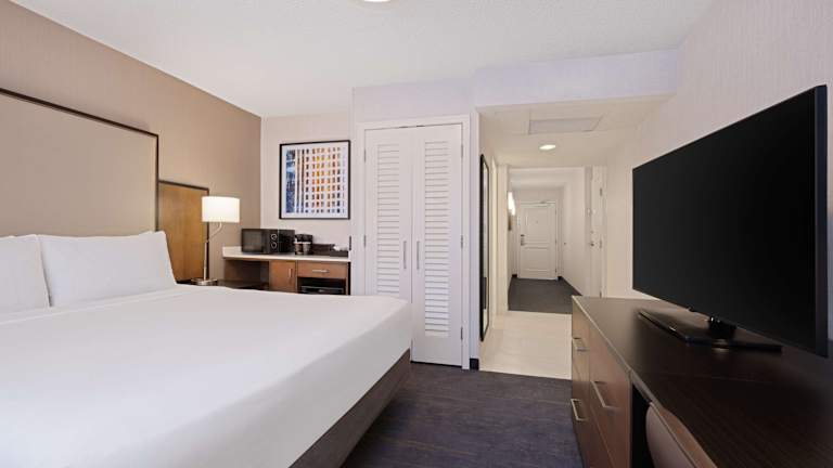 Die Suiten im Embassy Suites Chicago - Downtown River North sind modern und komfortabel eingerichtet. Jede Suite verfügt über ein privates Schlafzimmer und ein geräumiges Wohnzimmer, in dem sich 2 Flachbildfernseher befinden. Die Suiten sind in warmen Farben gestaltet und mit dunklen Holzmöbeln ausgestattet. Zur weiteren Ausstattung gehören ein kleiner Kühlschrank, eine Mikrowelle und eine iPod-Dockingstation.