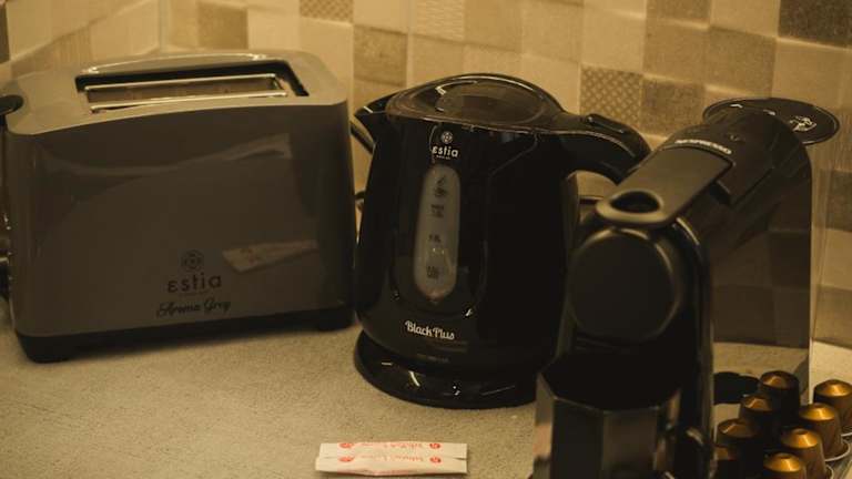 Die Ferienwohnung umfasst eine voll ausgestattete Küche, die mit einem Kühlschrank und einer Kaffeemaschine ausgestattet ist. Es sind keine weiteren Verpflegungsoptions beschrieben.