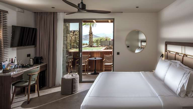 Die Zimmer sind modern und hell gestaltet und bieten größtenteils einen Balkon oder eine Terrasse mit Meerblick. Jedes Zimmer ist mit einem Doppelbett, einem Sofabett, Klimaanlage, Minibar, Safe, und einem Flachbildfernseher ausgestattet. Die Badezimmer verfügen über eine Whirlwanne, Kosmetikartikel, einen Kosmetikspiegel und Bademäntel. Zur weiteren Ausstattung gehören Teezubereiter, WLAN, Hausschuhe und Nichtraucherzimmer.