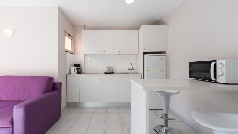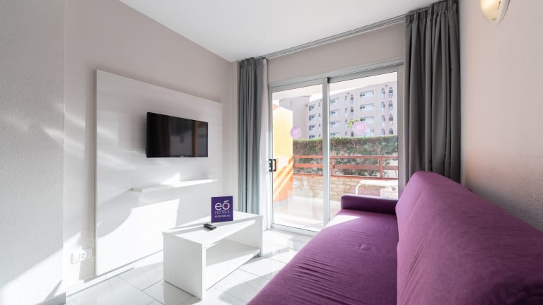 Appartement mit 35 m2 Privater Balkon in jedem Appartement Mit Blick auf den Pool / Garten Wohnzimmer mit Sofa und Beistelltisch 32″ Satellitenfernseher Bad mit Dusche Mobilierte Terrasse Safe (gegen Gebühr) WIFI – 4G Mobile gegen Gebühr Haartrockner Das zweites Kind bekommt ein Extrabett.