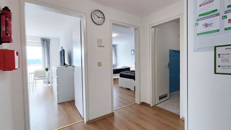 Die Ferienwohnung umfasst zwei Schlafzimmer und ein Bad mit Badewanne. Die Küche ist mit einem Kühlschrank und einem Geschirrspüler ausgestattet. Handtücher und Bettwäsche werden bereitgestellt. Es handelt sich um Nichtraucherzimmer und der Zugang erfolgt über einen Aufzug.